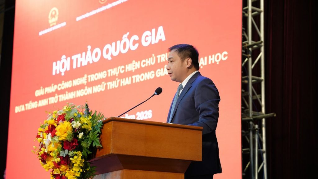Phát biểu chào mừng, đồng chí Đào Thanh Trường, Phó Giám đốc Đại học Quốc gia Hà Nội khẳng định vai trò tiên phong của các cơ sở giáo dục đại học trong việc đổi mới phương pháp giảng dạy, tăng cường ứng dụng công nghệ và thúc đẩy môi trường học thuật đa ngôn ngữ. Đồng chí cho rằng việc triển khai chủ trương đưa tiếng Anh trở thành ngôn ngữ thứ hai cần gắn chặt với ứng dụng khoa học công nghệ, đặc biệt là trí tuệ nhân tạo và chuyển đổi số. Hai từ khóa được nhấn mạnh là “kết hợp” – giữa công nghệ và chủ trương lớn trong giáo dục, và “kết nối” – giữa các cơ quan quản lý, cơ sở giáo dục, nhà khoa học và doanh nghiệp nhằm tạo sức mạnh tổng hợp. Theo đó, công nghệ không chỉ là công cụ hỗ trợ mà còn đóng vai trò then chốt trong xây dựng chương trình, đổi mới phương pháp giảng dạy, kiểm tra đánh giá, phát triển đội ngũ và hình thành môi trường học tập bằng tiếng Anh.