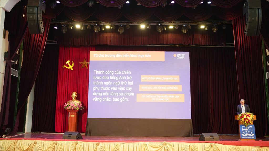 Báo cáo tiếp theo có chủ đề “Giải pháp công nghệ hỗ trợ chủ trương đưa tiếng Anh thành ngôn ngữ thứ hai trong giáo dục đại học – Góc nhìn và sáng kiến từ Đại học RMIT Việt Nam” đến từ Giáo sư Iwona Miliszewska, Trưởng khoa Khoa Khoa học, Kỹ thuật và Công nghệ, và ông Hossein Davari, Trưởng khoa Khoa Tiếng Anh và Chuyển tiếp đại học. Tham luận nhấn mạnh việc kết hợp nền tảng sư phạm vững chắc với công nghệ và trí tuệ nhân tạo (AI) là yếu tố then chốt để triển khai hiệu quả chủ trương đưa tiếng Anh trở thành ngôn ngữ thứ hai trong giáo dục đại học. Báo cáo đề xuất khung triển khai EMI dựa trên ba trụ cột: năng lực người học, phát triển giảng viên và đảm bảo chất lượng.